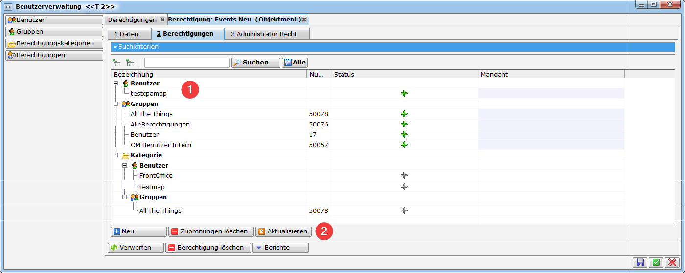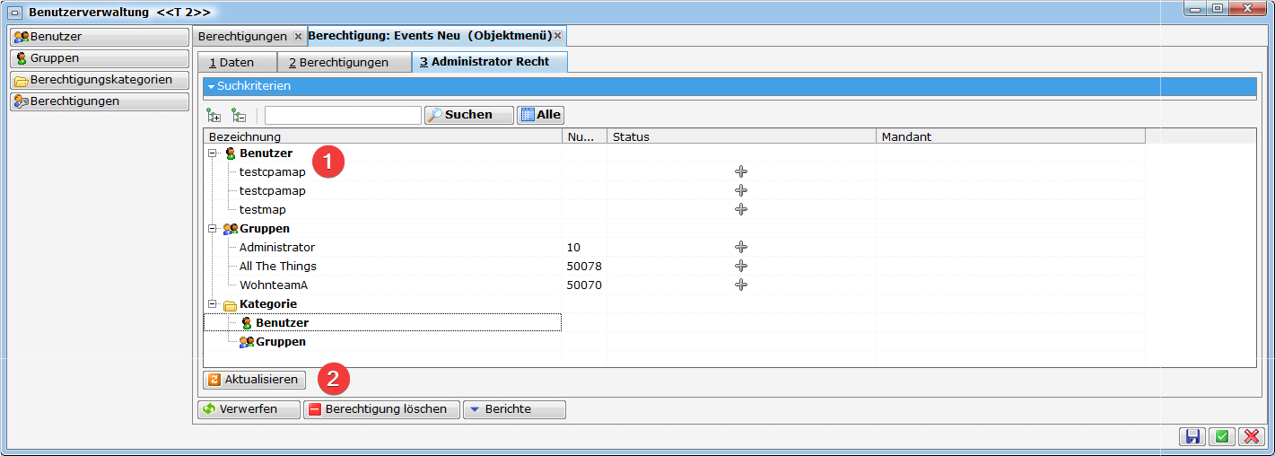 Grundsätzlich haben Nutzer nur die Rechte, die Ihnen explizit (direkt oder über Gruppen) zugewiesen werden. Das heißt, dass auch neue Berechtigungen immer den gewünschten Gruppen zugewiesen werden müssen, damit sie darauf Zugriff haben. Eine Ausnahme bildet die Gruppe Administrator. Diese Gruppe hat immer alle Rechte, auch neu hinzukommende. Zur Fehlerbehebung ist es deshalb möglich, einem Benutzer kurzfristig Administratorrechte zu verleihen (siehe Zeitweilige Erweiterung von Rechten). Eine weitere Möglichkeit zur automatischen Zuweisung von neuen Berechtigungen ist die Arbeit mit Berechtigungskategorien (siehe Berechtigungskategorien).