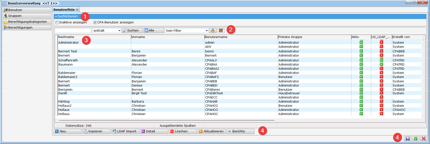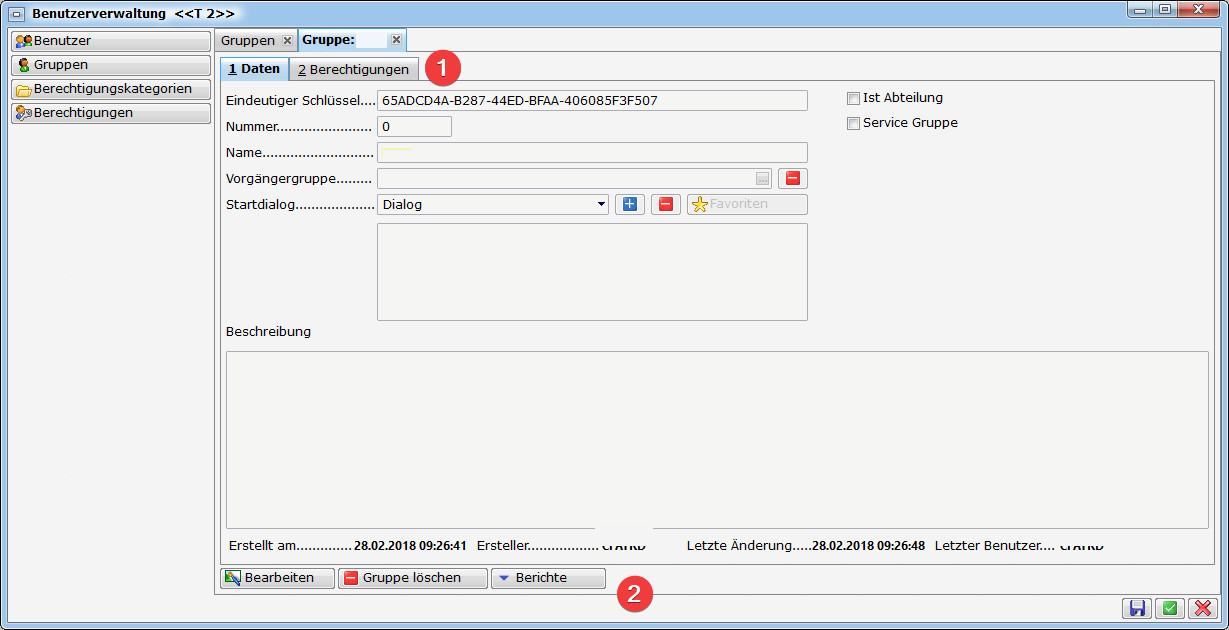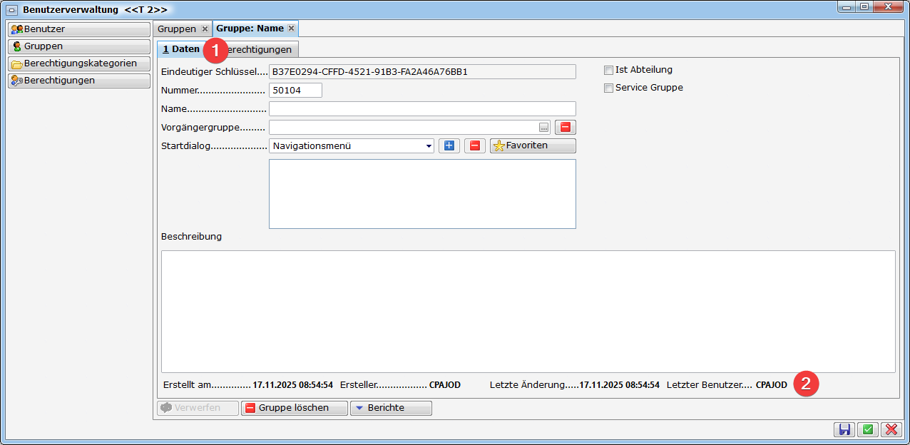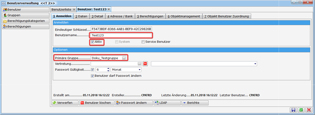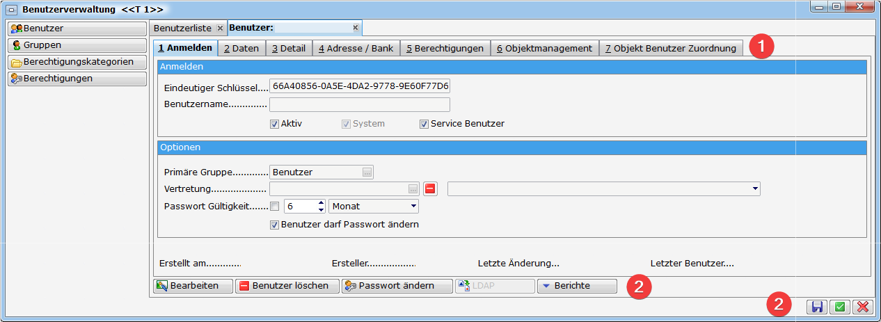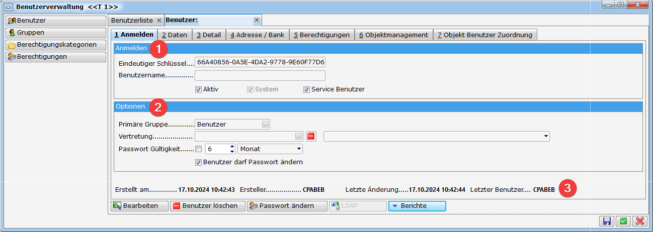 Benutzername: Der gewählte Benutzername muss eindeutig sein. Der Benutzername dient in vielen Bereichen als Identifizierung des Bearbeiters bzw. wird auch in Berichten angedruckt. Idealerweise vergeben Sie einen kurzen aussagekräftigen Namen, damit der Benutzername in den vom System vorgegebenen Stellen auch zur Gänze angezeigt werden kann. Als Beispiel sehen Sie den Namen beim Ersteller (siehe Bild Bereich 3).Haben Sie einen Benutzer über LDAP importiert, erscheint neben dem eindeutigen Schlüssel auch ein LDAP Schlüssel (LDAP Guid), der die Verbindung zum Windowsnutzer herstellt. Mit Klick auf das rote Minus