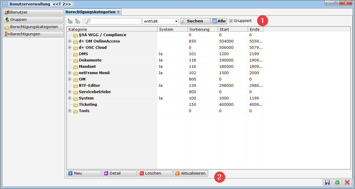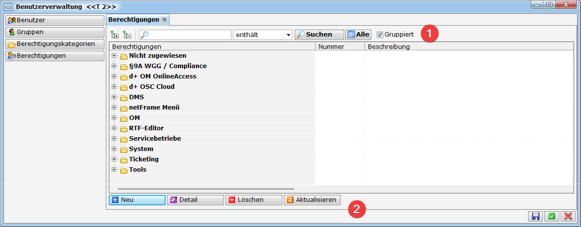 Nicht jeder Benutzer hat das Recht, alle Bereiche im d+ OM einzusehen oder zu verändern. Um nicht befugten Benutzern das Einsehen von Informationen oder Änderungen in diesen Bereichen zu verweigern, gibt es die Berechtigungen. Diese können auch bei mehreren Mandanten jeweils unterschiedlich vergeben werden. Außerdem können über das Entziehen von Berechtigungen nicht genutzte Module ausgeblendet werden. Berechtigungen werden Benutzern entweder direkt zugeordnet oder über Gruppen verwaltet. Eine Gruppe hat bestimmte Berechtigungen und Benutzer gehören immer mindestens einer Gruppe an. Somit muss nicht jedem Benutzer eine ganze Palette an Berechtigungen einzeln zugewiesen werden, sondern mithilfe der Gruppen können Benutzer mit gleichen Aufgaben schnell und einfach die gleichen Rechte erhalten.