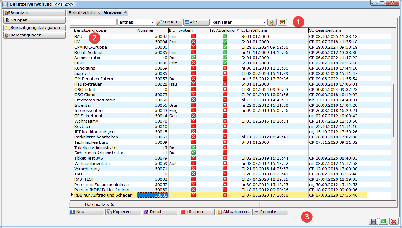 Außerdem empfehlen wir Ihnen, ausscheidende Mitarbeiter (ausscheidende Benutzer) aus Dokumentationsgründen für Historien nicht zu löschen, sondern IMMER nur inaktiv zu setzen.System: Da firmeneigene Daten ausgeliefert werden, die nicht gelöscht werden können, erhält der Datensatz in der Benutzerliste das Kennzeichen „System“.