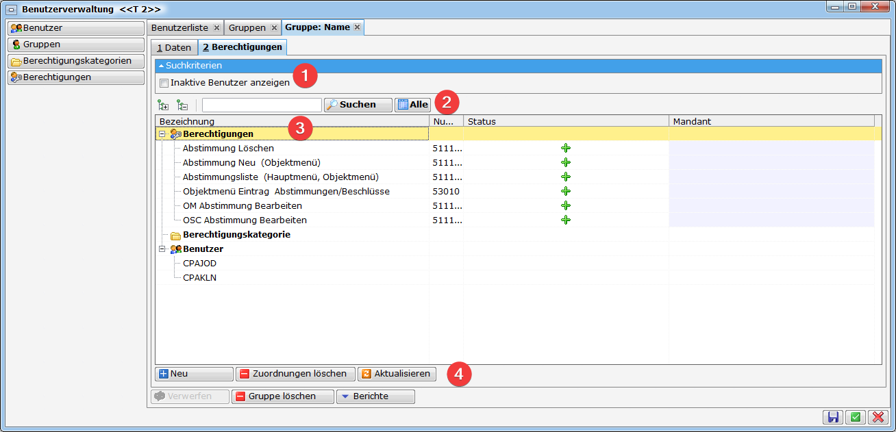 Bei häufigen Kombinationen mehrerer Berechtigungen ist es empfehlenswert, eine neue Gruppe mit den entsprechenden Berechtigungen anzulegen und den Benutzer dieser Gruppe zuzuweisen. Bei bereits bestehenden Gruppen müssen Sie diese lediglich dem Benutzer zuweisen (entweder in der letzten Lasche der Benutzerdetails oder in den Gruppendetails). Es gibt keine Beschränkung dafür, wie vielen Gruppen ein Benutzer angehören darf.