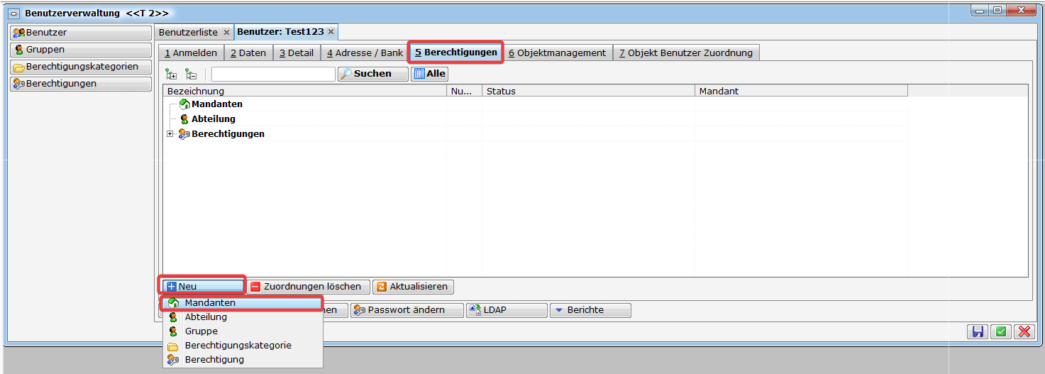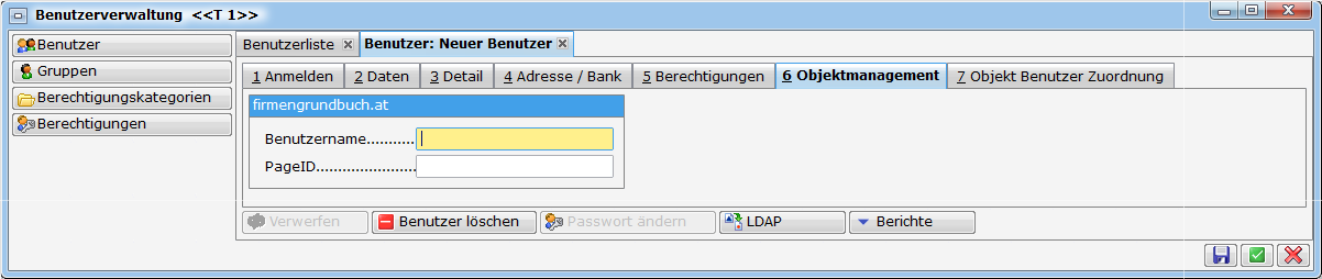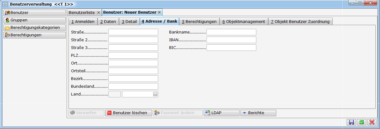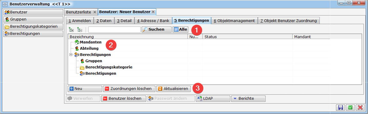 In den einzelnen Registerblättern können Sie alle relevanten Informationen zum Benutzer hinterlegen. Besonders wichtig sind hierbei die Zuordnungen der entsprechenden Berechtigungen.