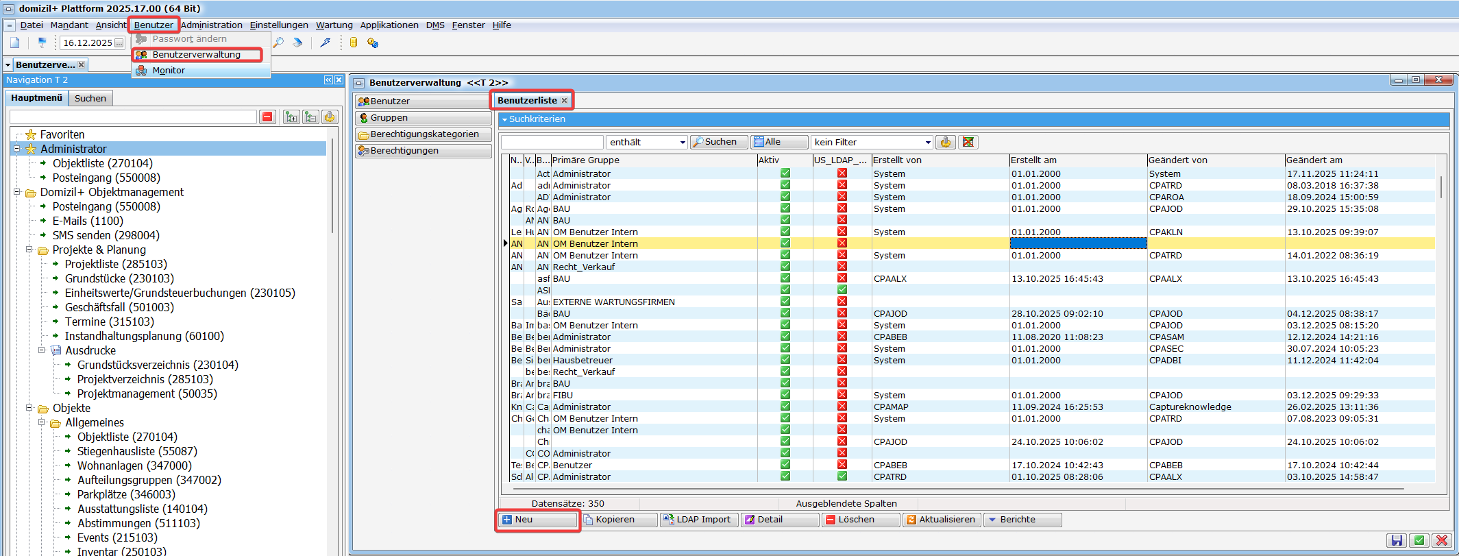 Neu: Wenn Sie auf Neu klicken, öffnet sich der Benutzer-Detaildialog, um einen neuen Benutzer anzulegen.