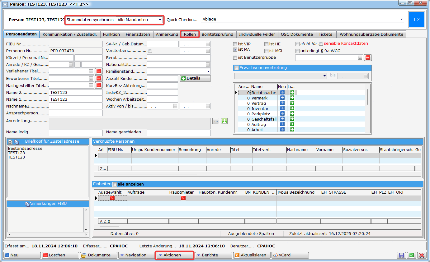 Weiterhin sollten Sie bei der Verwendung mehrerer Mandanten darauf achten, dass in der Combobox „Stammdaten synchronis“ „Alle Mandanten“ ausgewählt ist. Damit wird mit Speichern der Person eine Kopie für jeden Mandanten angelegt. Wenn Sie also später nach der Person suchen, existiert diese mehrfach in der Datenbank, einmal für jeden Mandanten.