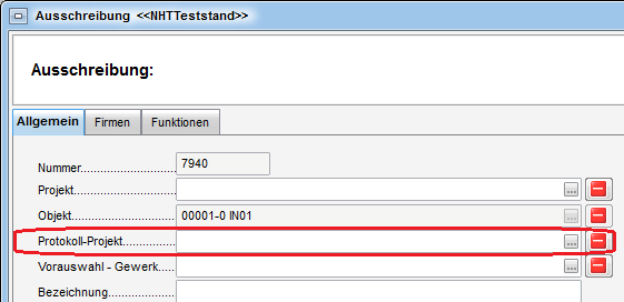 Ist im Register Allgemein ein Objekt mit diesem Protokoll verknüpft, werden alle Ausschreibungen zu diesem Objekt hier angezeigt und können per Doppelklick geöffnet werden. Zusätzlich gibt es die Möglichkeit, eine Ausschreibung mit einem Protokoll zu verknüpfen. Dazu müssen Sie in die Ausschreibungsdetails wechseln: