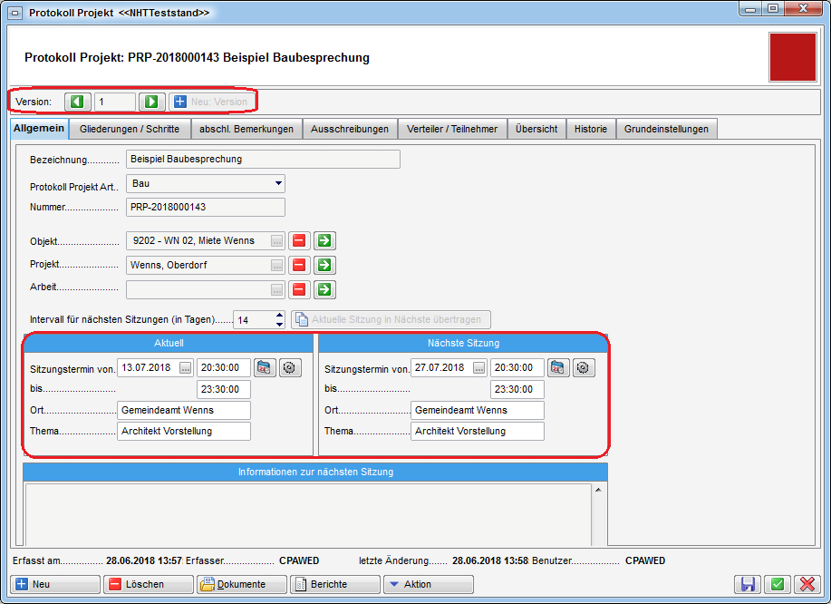 Hier wurde nun eine weitere Version erstellt und die Daten aus dem Bereich Nächste Sitzung wurden in den Bereich Aktuell übertragen.
