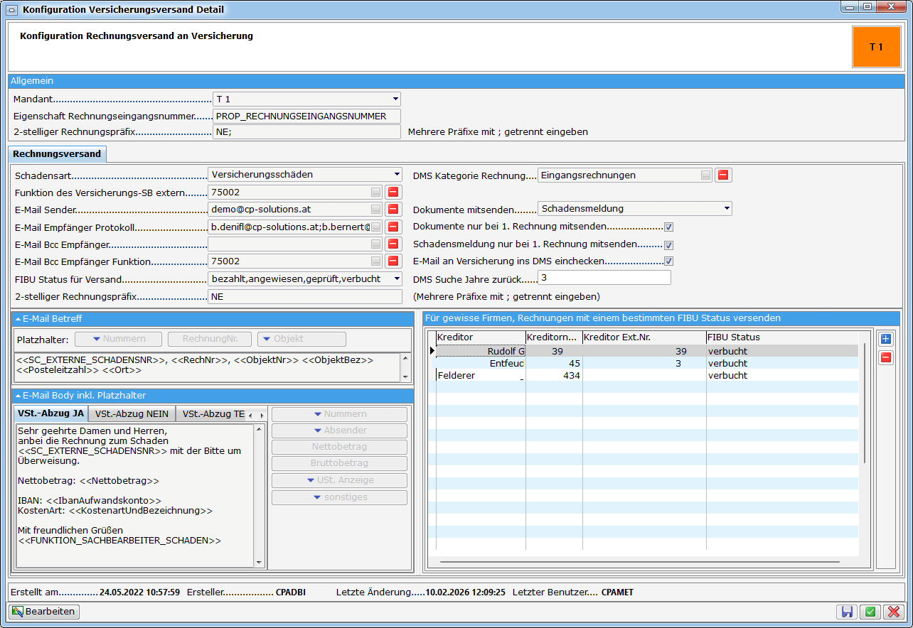 Für den Versand der Schadensmeldung ist es möglich, den Mailtext zu konfigurieren. Zu den Mailtexten gelangen Sie über das Hauptmenü unter dem Namen "Mailtexte". In der Liste der Mailtexte gibt es einen Eintrag mit der Beschreibung „Schadensmeldung an Versicherung". Mit einem Doppelklick öffnen Sie den Detaildialog und können hier die Einstellungen vornehmen. Nähere Information finden Sie unter Administratorenhandbuch / Mailtexte.