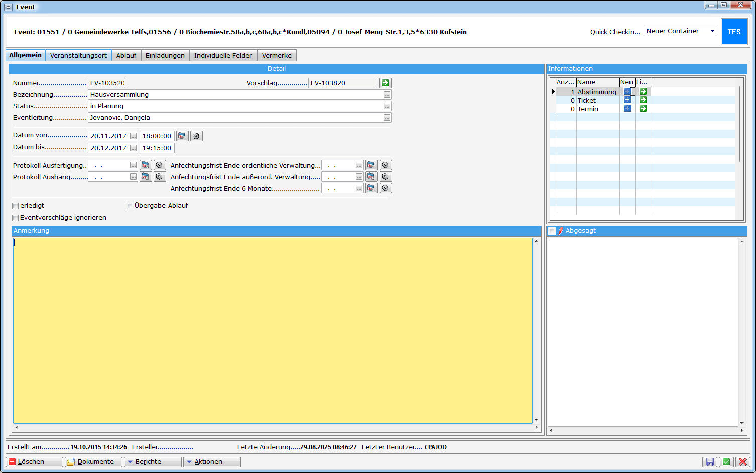 Im Bereich Anmerkung können Sie noch weitere Einzelheiten hinzufügen. Dieser Bereich kann über die globale Variable 1880 GLOBAL_EVENT_LASCHE_INFO deaktiviert werden.