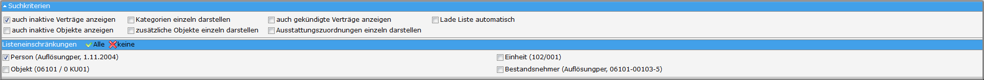Durch aktivieren der vorhandenen Checkboxen haben Sie die Möglichkeit auch inaktive Verträge anzeigen, Kategorien einzeln darstellen, auch gekündigte Verträge anzeigen, auch inaktive Objekte anzeigen, zusätzliche Objekte einzeln darstellen oder Ausstattungszuordnungen einzeln darstellen anzeigen zu lassen.