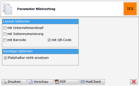 Vorschau/Druck: Hier gelangen Sie zum Parameterdialog Mietvertrag. Sie können den Paramterdialog nur öffnen, sofern eine Vertragsvorlage hinterlegt ist.