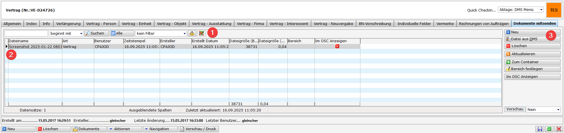 Dokumente: Über diesen Button haben Sie Zugriff auf die Serienbriefvorlagen und das DMS.