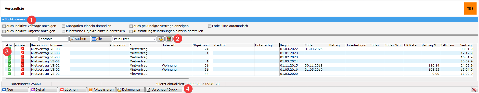 Neu: Über diesen Button starten Sie die Erstellung eines neuen Vertrags. Dabei wird ein leeres Formular geöffnet, in dem alle erforderlichen Vertragsdaten eingetragen werden können.